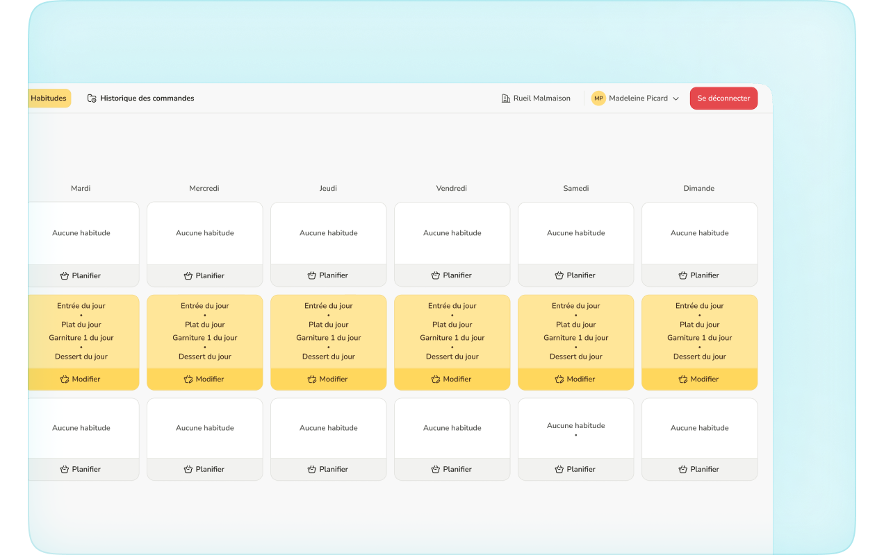 Offrez à vos clients une vue claire de leurs commandes et habitudes de consommation grâce à un calendrier intuitif, accessible dans l'onglet dédié « Habitudes ».